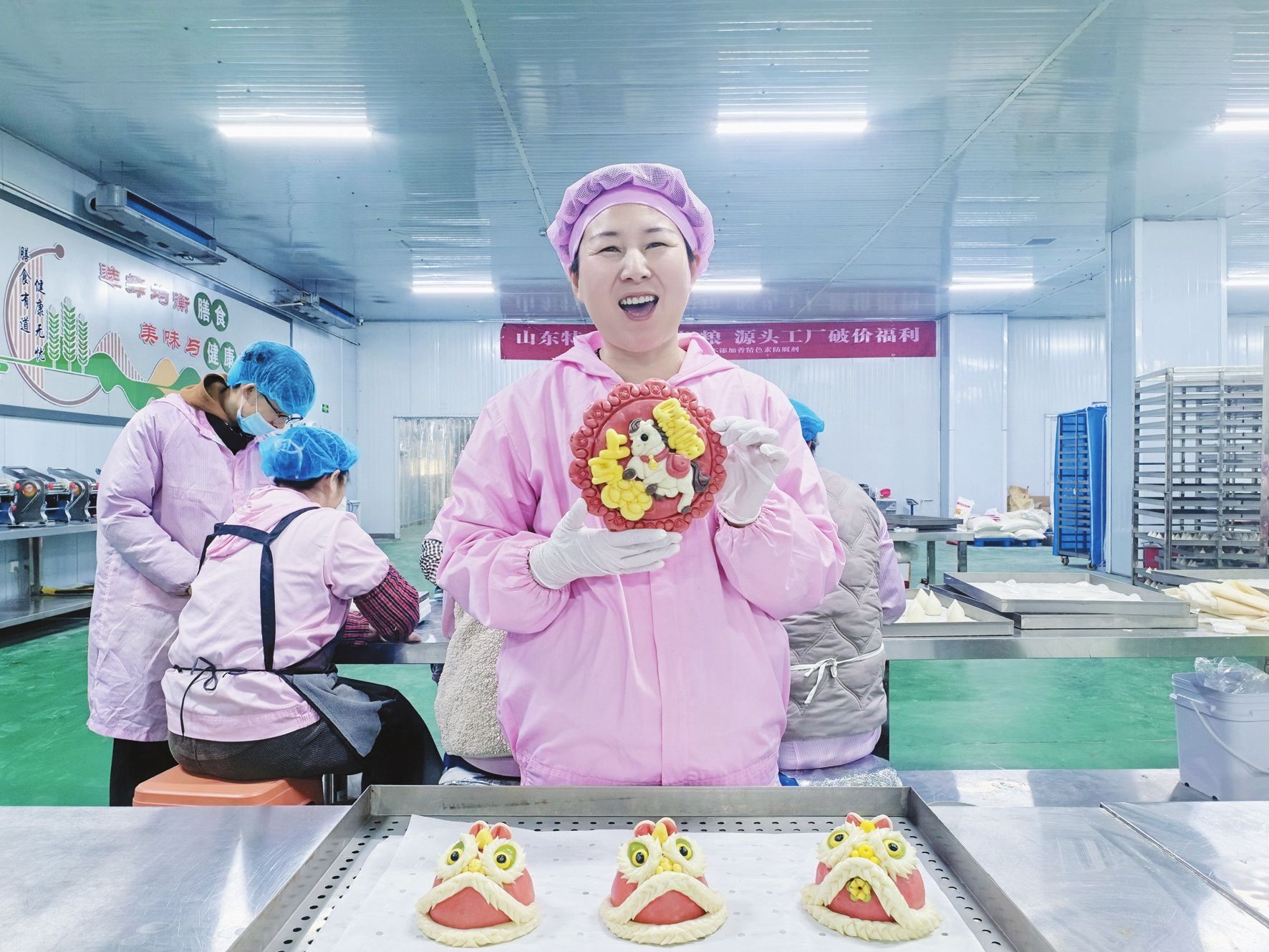 技藝完成轉(zhuǎn)化,如何讓更多人知曉?借短視頻平臺(tái),打破地域限制。直播間的鏡頭前,熱氣騰騰的饅頭被掰開,發(fā)酵面食自然的色澤和清晰可見的層次瞬間吸引了粉絲的目光,主播通過老肥發(fā)酵的故事將技藝背后的文化娓娓道來。流量轉(zhuǎn)化為來自天南地北的訂單,大家只為尋覓這一口地道的非遺風(fēng)味。同時(shí),楊永興敏銳捕捉市場(chǎng)對(duì)健康、多元的需求,以傳統(tǒng)技藝為根基,研發(fā)出菜團(tuán)子、雜糧窩頭、創(chuàng)意花饃等新產(chǎn)品,讓古老的饅頭技藝生發(fā)出繽紛的當(dāng)代形態(tài)。如今,從樂陵到平原,兩座現(xiàn)代化食品工廠拔地而起,僅非遺千層饅頭一年就能賣出500萬個(gè)。