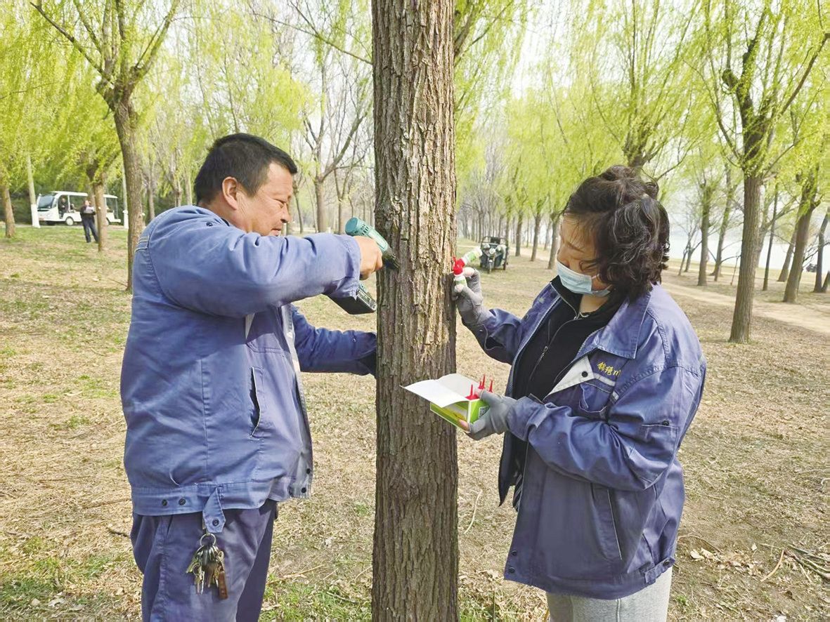 眼下,楊柳飛絮防控工作進入關(guān)鍵籌備期。市城管局錦繡川景區(qū)依托往年楊柳樹排查數(shù)據(jù)庫,組織工作人員開展了新一輪全面拉網(wǎng)式排查,對景區(qū)內(nèi)所有楊柳樹進行逐株登記、精準(zhǔn)識別。3月下旬,搶抓春季樹木樹液流動關(guān)鍵期,對楊柳樹雌株集中開展抑制劑注射作業(yè)。“我們根據(jù)樹木胸徑大小確定打孔數(shù)量和施藥量,確保藥劑能夠隨樹木蒸騰作用均勻擴散至樹冠各個部位,有效調(diào)控花芽分化,抑制次年飛絮生成?!卞\繡川景區(qū)綠化保潔隊副隊長劉琳介紹,截至目前,景區(qū)已為重點區(qū)域1800余株楊柳樹雌株開展飛絮抑制劑注射作業(yè),并將持續(xù)推進治理工作,確保實現(xiàn)全覆蓋、無遺漏。