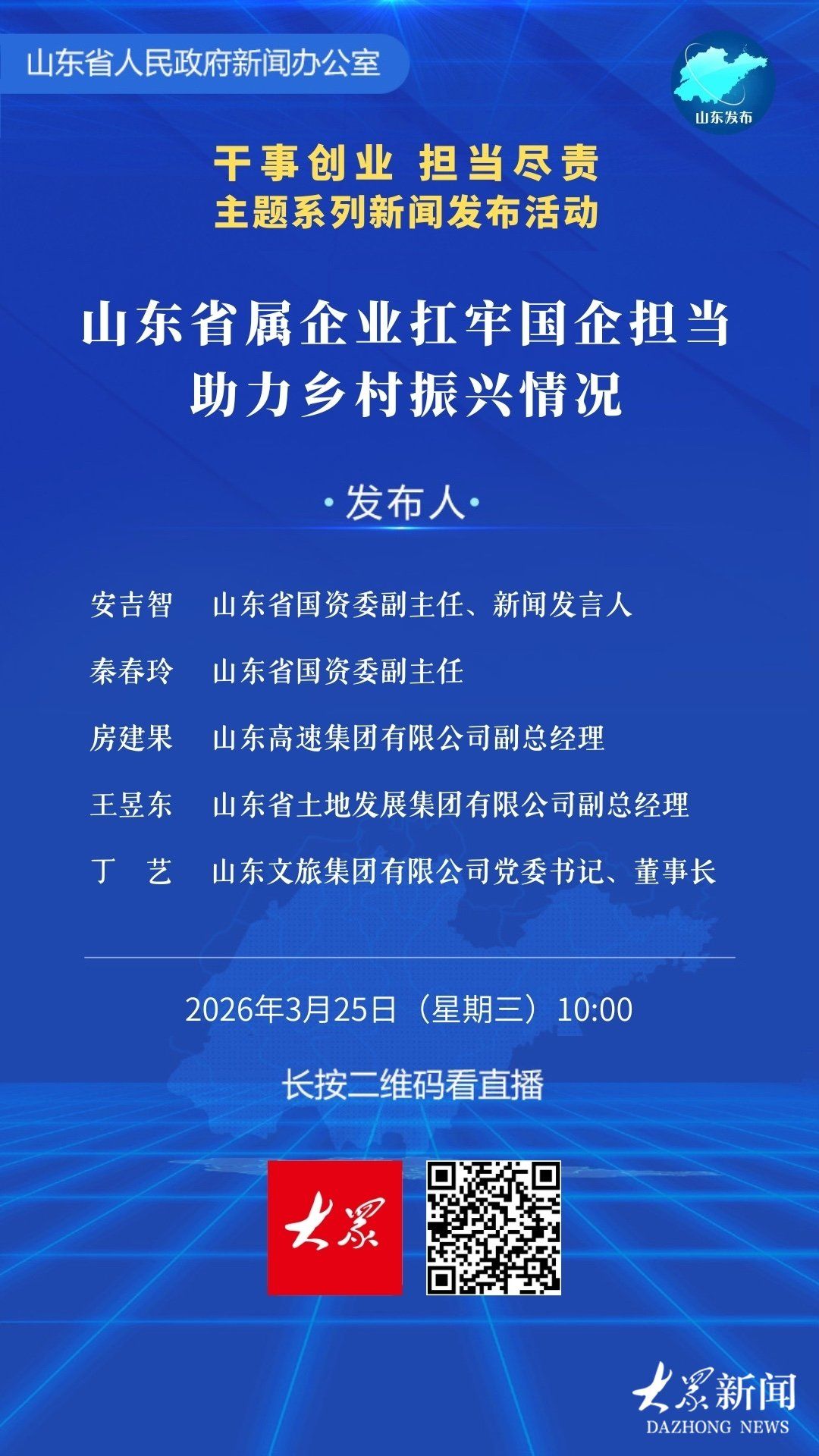 山東省人民政府新聞辦定于3月25日(周三)上午10:00舉行“干事創(chuàng)業(yè) 擔(dān)當(dāng)盡責(zé)”主題系列新聞發(fā)布會,邀請省國資委負(fù)責(zé)同志等介紹山東省屬企業(yè)扛牢國企擔(dān)當(dāng),助力鄉(xiāng)村振興情況。