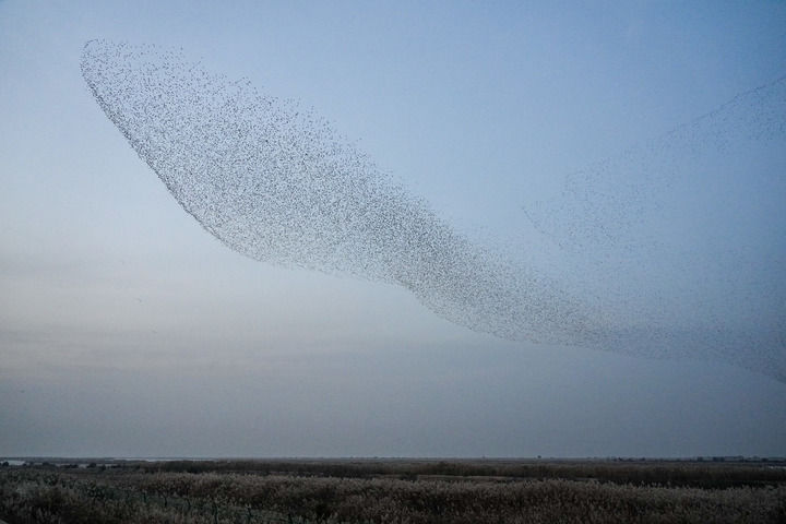 2025年11月12日,山東黃河三角洲國(guó)家級(jí)自然保護(hù)區(qū)內(nèi),飛翔的越冬候鳥形成“鳥浪”景象。新華社記者 朱崢攝