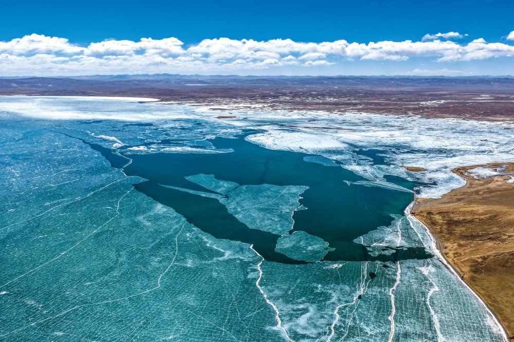 3月10日在青海省果洛藏族自治州瑪多縣境內(nèi)拍攝的扎陵湖一角。初春時(shí)節(jié),黃河源地區(qū)冰雪漸融。新華每日電訊記者張龍攝