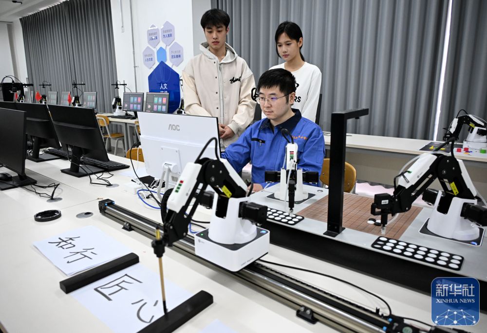 ↑ 3月26日,青島職業(yè)技術(shù)學(xué)院老師劉德鵬(前)在課堂上演示機器人漢字書寫。