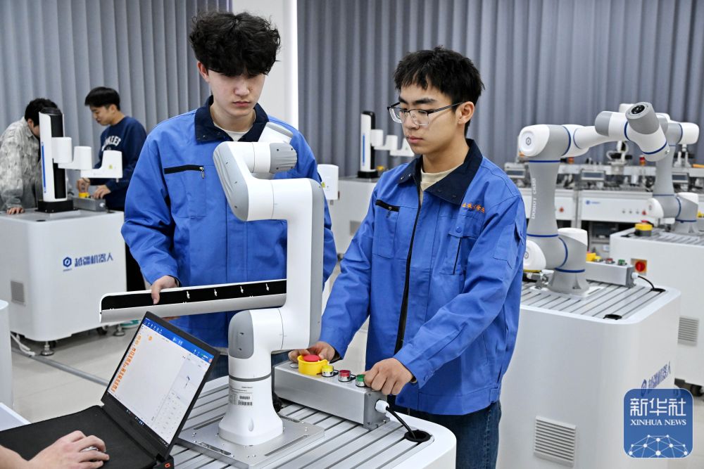 ↑ 3月26日,青島職業(yè)技術(shù)學(xué)院學(xué)生在機器人實訓(xùn)課上學(xué)習(xí)。