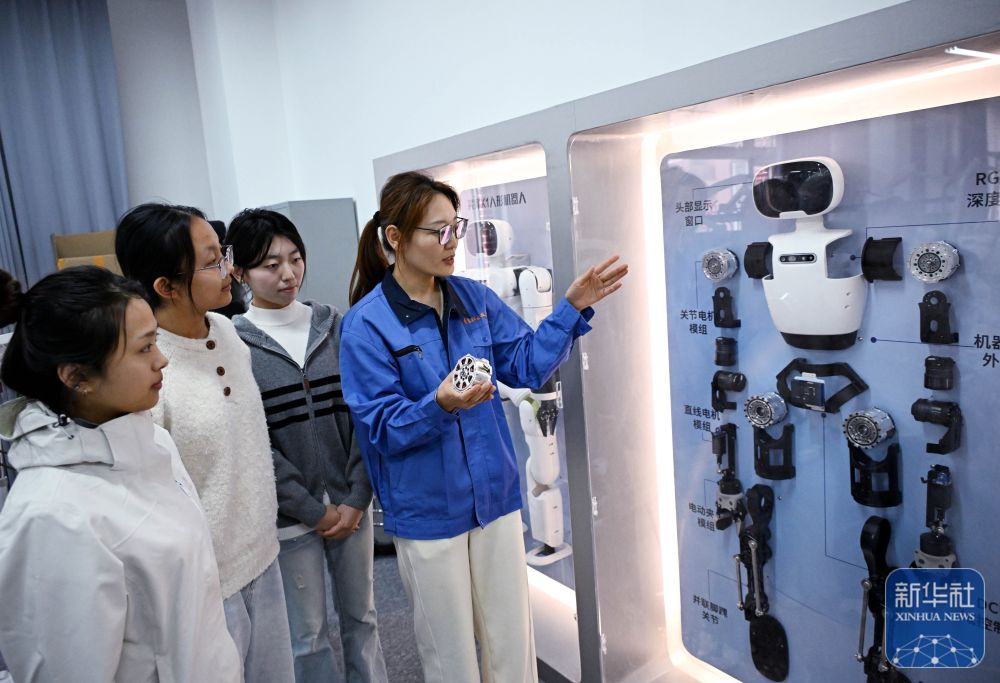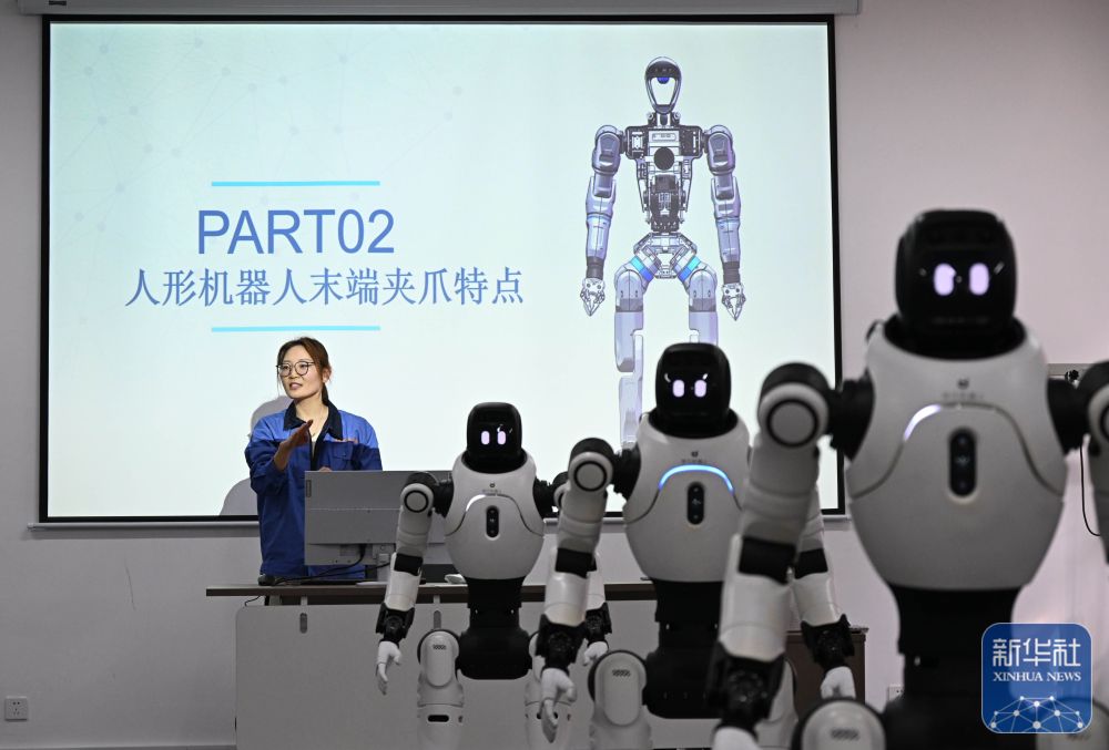↑ 3月26日,青島職業(yè)技術(shù)學(xué)院老師陳靜(右一)在課堂上講解人形機器人結(jié)構(gòu)。
