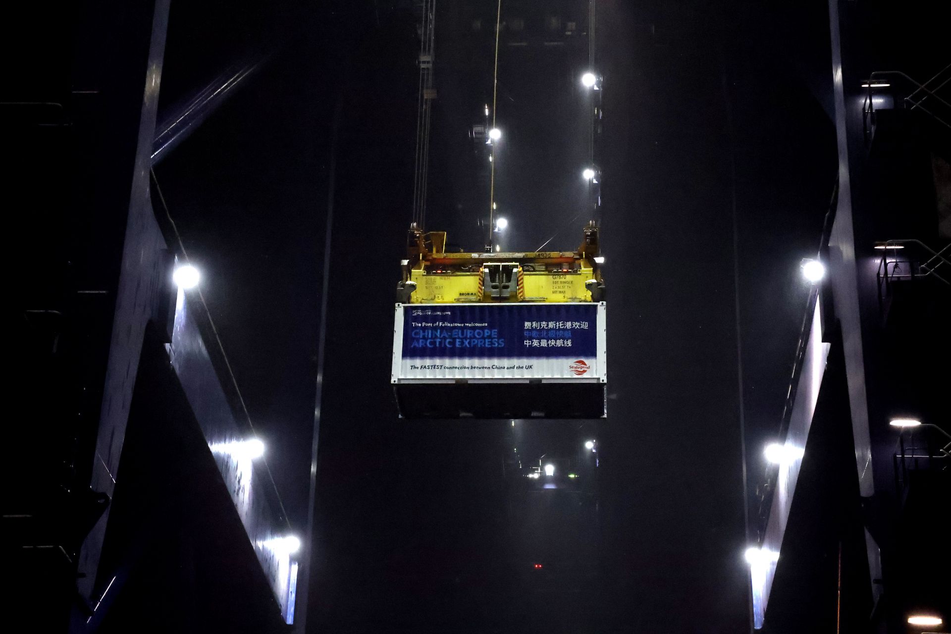 10月13日,在英國費利克斯托港,中歐北極快航航線首艘貨船舉行集裝箱卸載儀式。