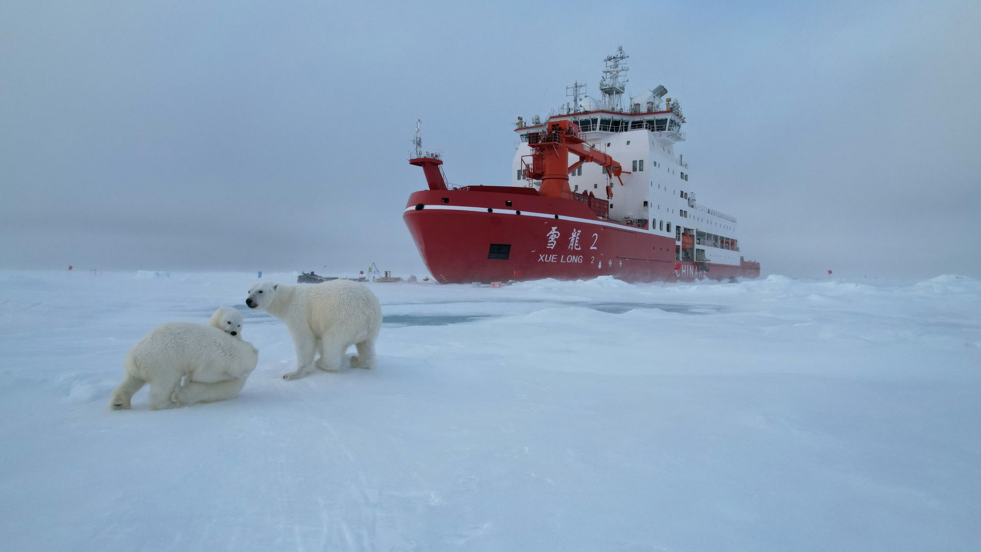 8月30日夜,在距離中國(guó)第15次北冰洋科學(xué)考察隊(duì)長(zhǎng)期冰站作業(yè)結(jié)束還剩一天時(shí),一只北極熊媽媽帶著兩只熊寶寶出現(xiàn)在了考察隊(duì)員搭乘的“雪龍2”號(hào)極地科考破冰船船邊。
