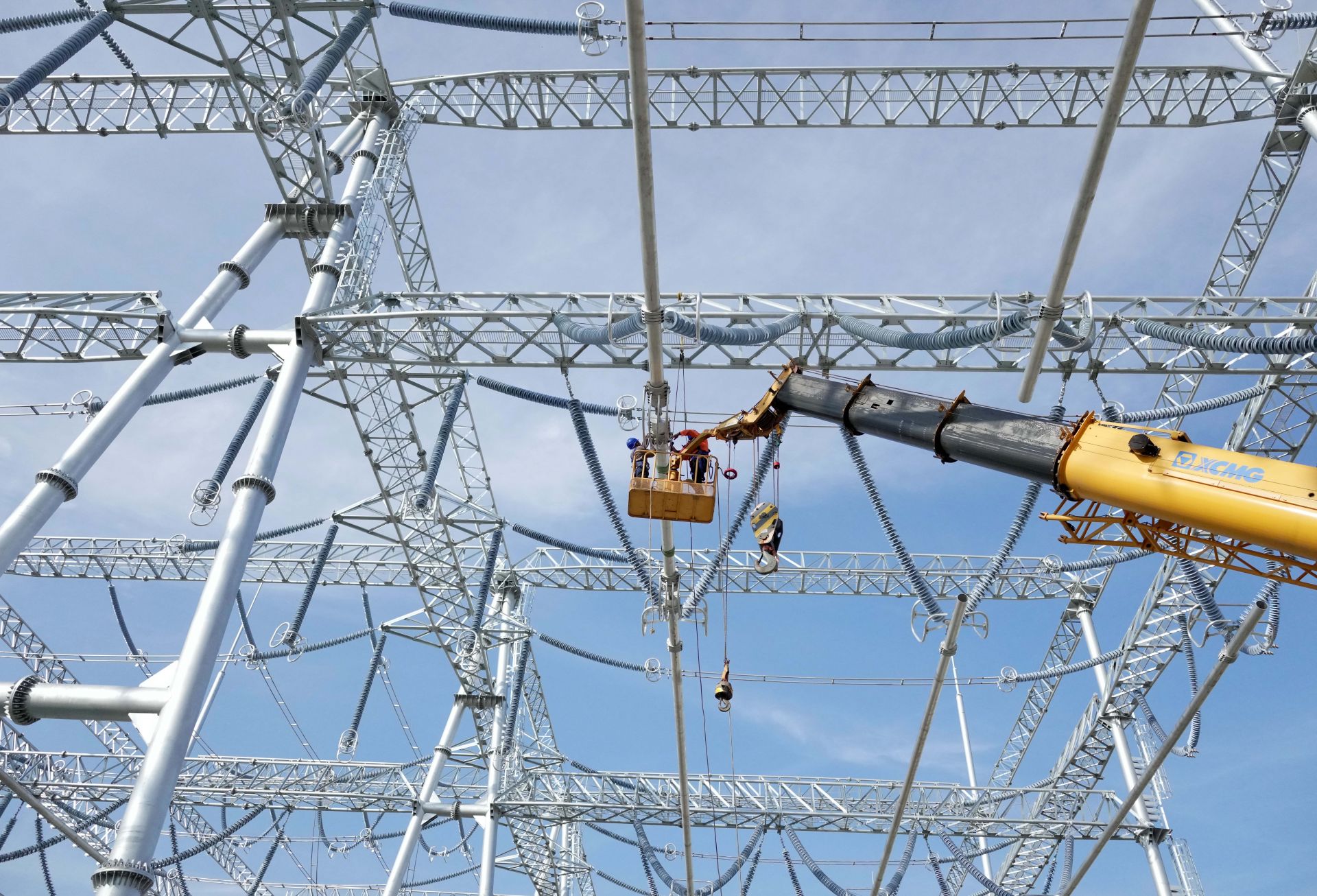 10月14日,工人在位于河北省寧晉縣境內(nèi)的國網(wǎng)邢臺(tái)北500千伏超高壓變電站建設(shè)工地施工。
