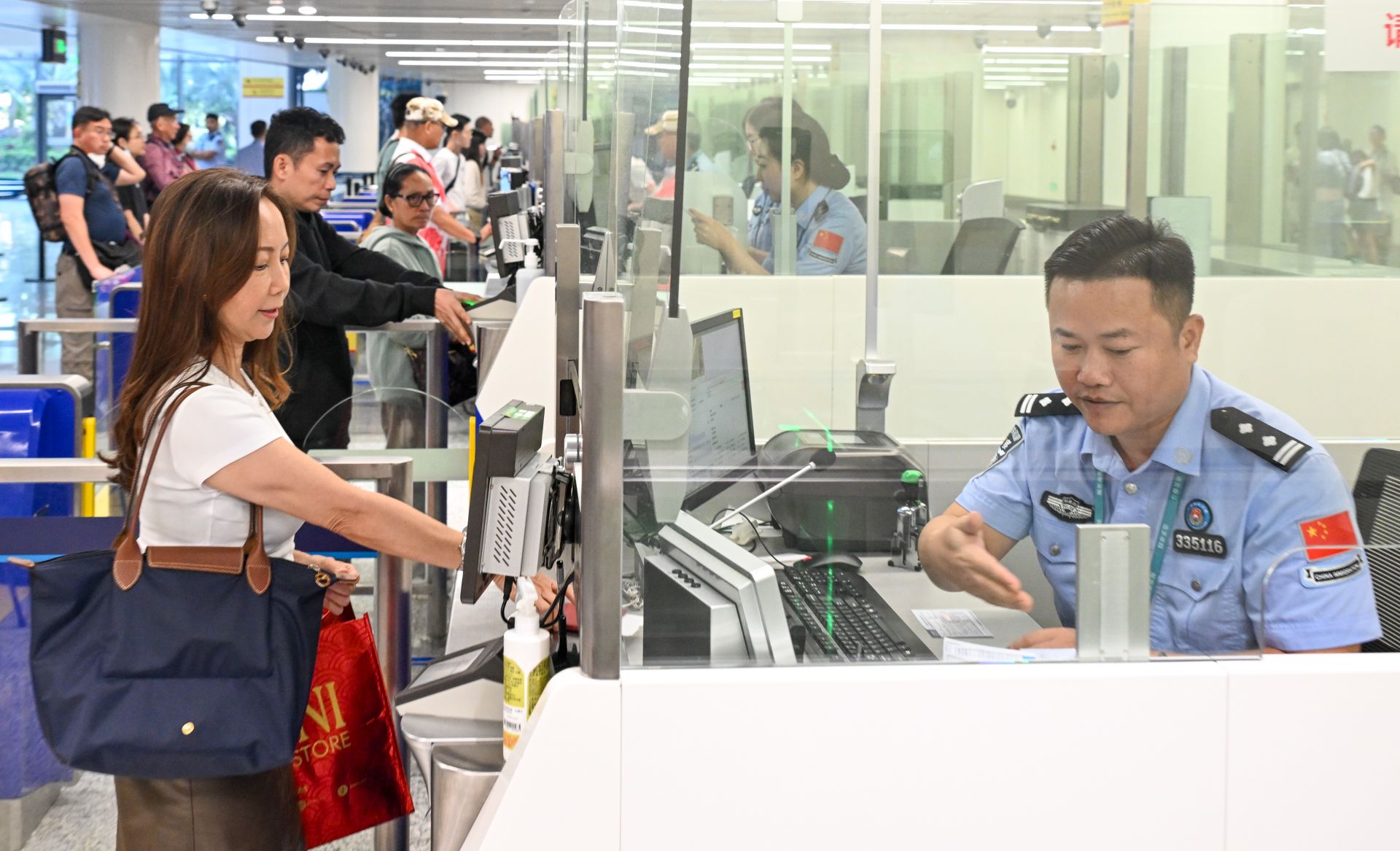 10月15日,入境旅客在海口美蘭邊檢站辦理邊檢手續(xù)。