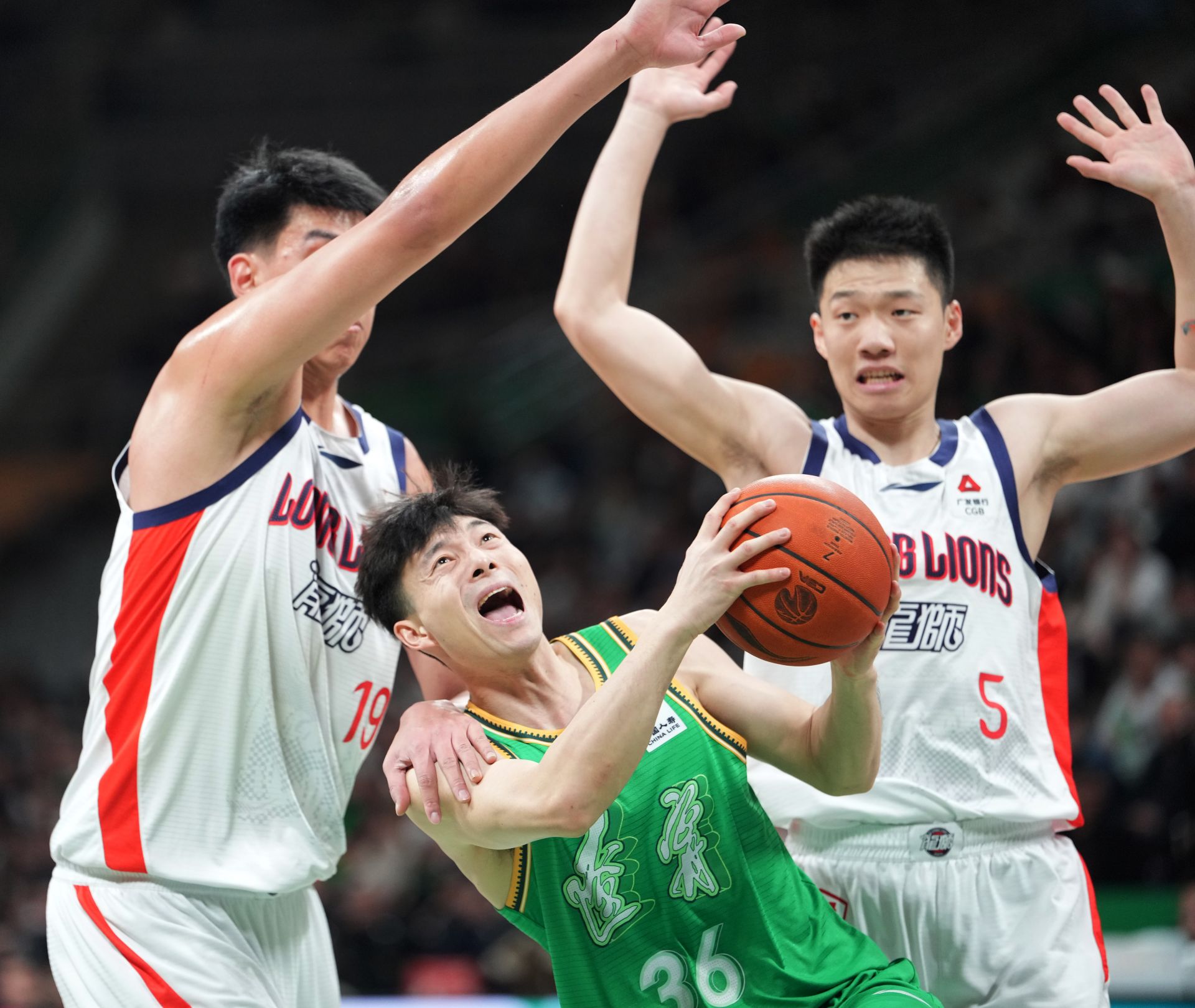 3月18日,遼寧本鋼隊(duì)球員鄢手騏(中)進(jìn)攻受阻。