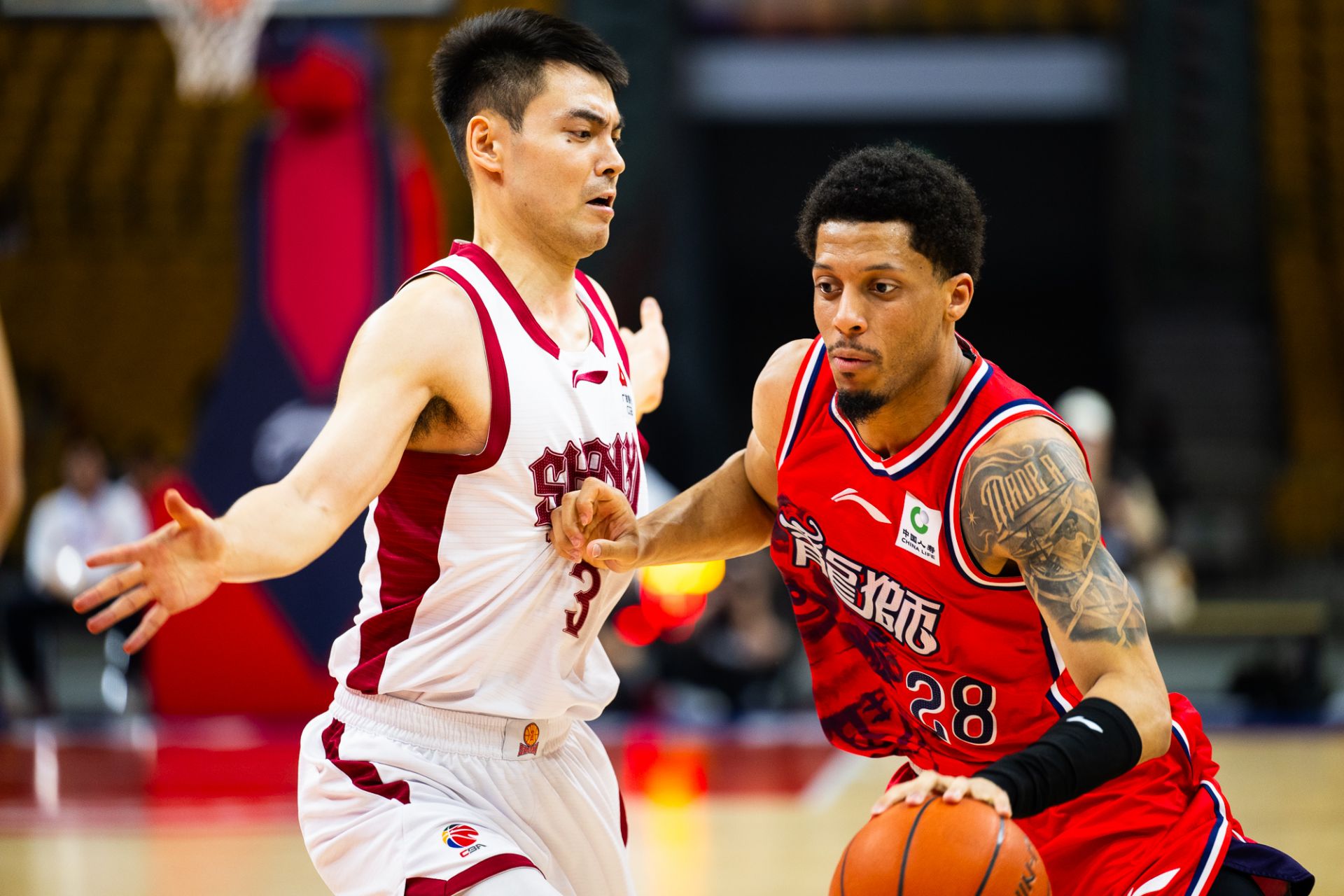 3月23日,山西汾酒隊球員賈明儒(左)在比賽中防守廣州朗肽海本隊球員威金頓。