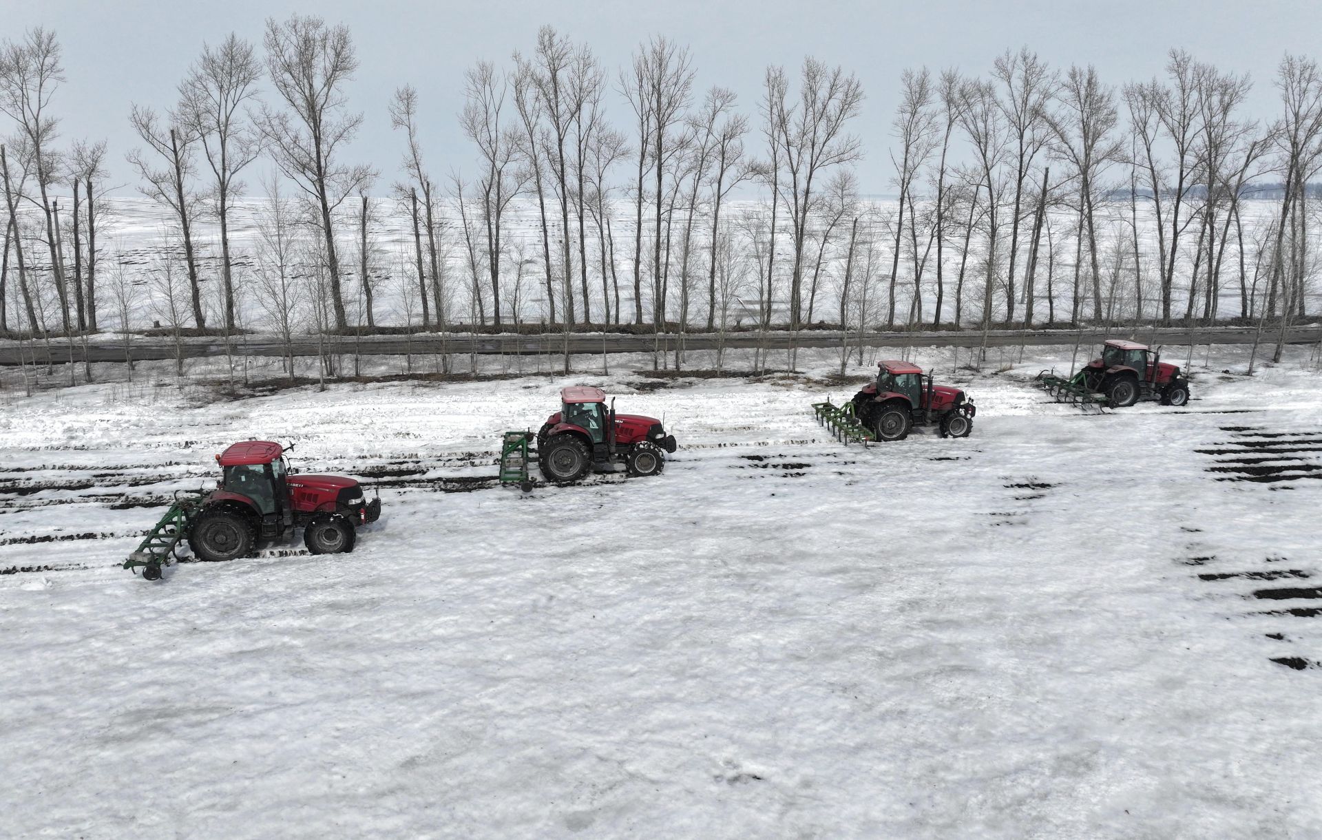 3月24日,北大荒集團北安分公司襄河農場有限公司第一管理區(qū)大豆地塊,大馬力機車在進行耙雪散墑作業(yè)(無人機照片)。