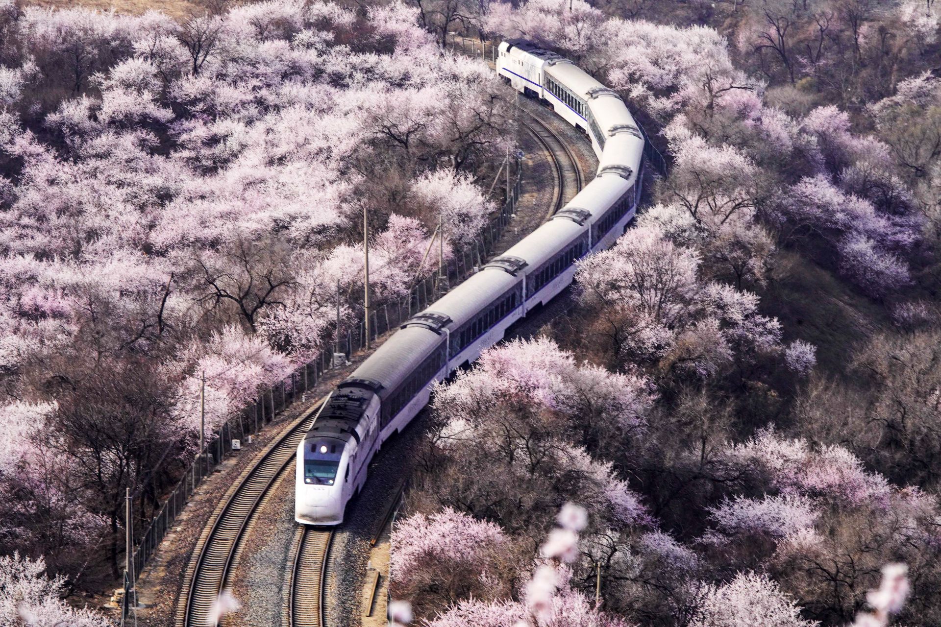 3月24日,一列客運(yùn)列車穿行在北京市居庸關(guān)長(zhǎng)城腳下的花海中。