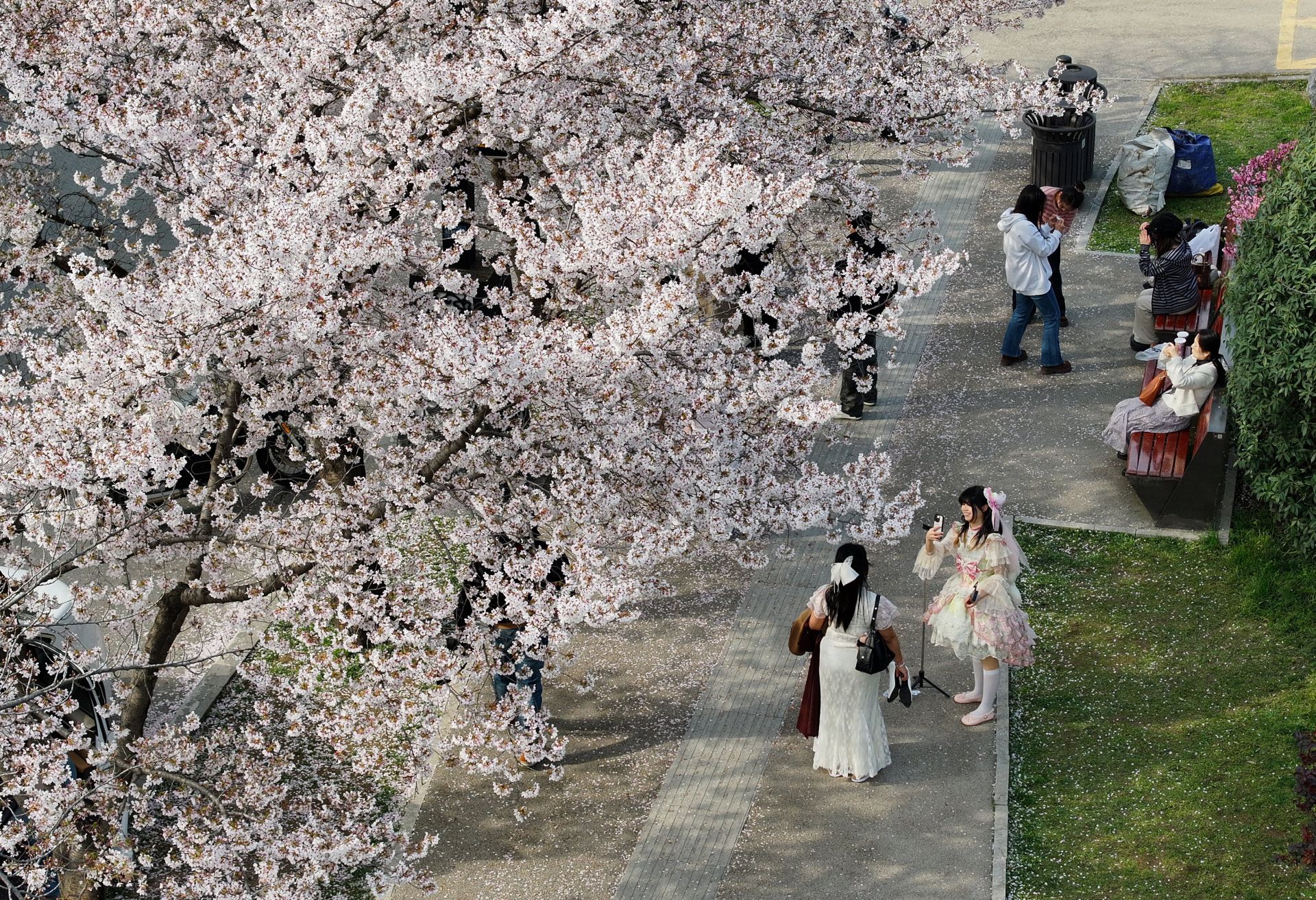 3月24日,游人在西安市雁塔區(qū)曲江池西路的櫻花樹下拍照、游玩(無(wú)人機(jī)照片)。