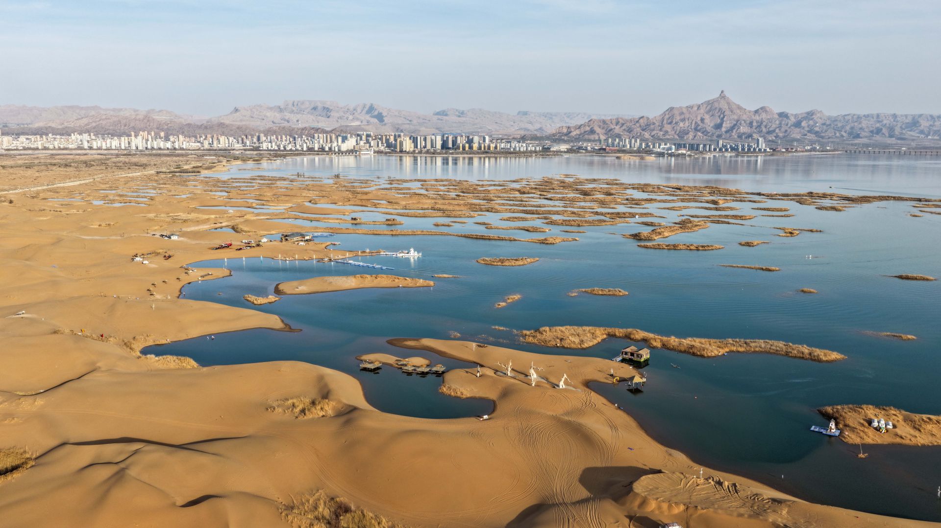 3月25日拍攝的烏海市烏海湖與沙漠美景(無人機照片)。