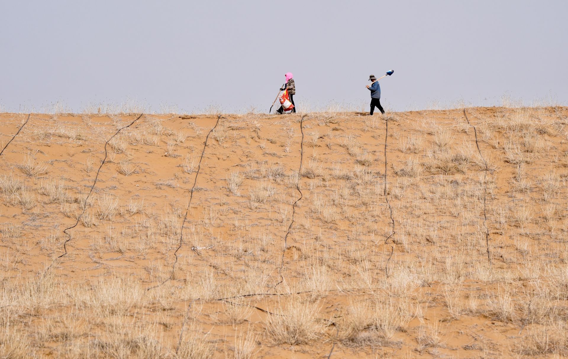 3月25日,治沙工人在位于寧夏中衛(wèi)市國(guó)有林業(yè)總場(chǎng)長(zhǎng)流水管理站的騰格里沙漠東南緣補(bǔ)種沙拐棗。