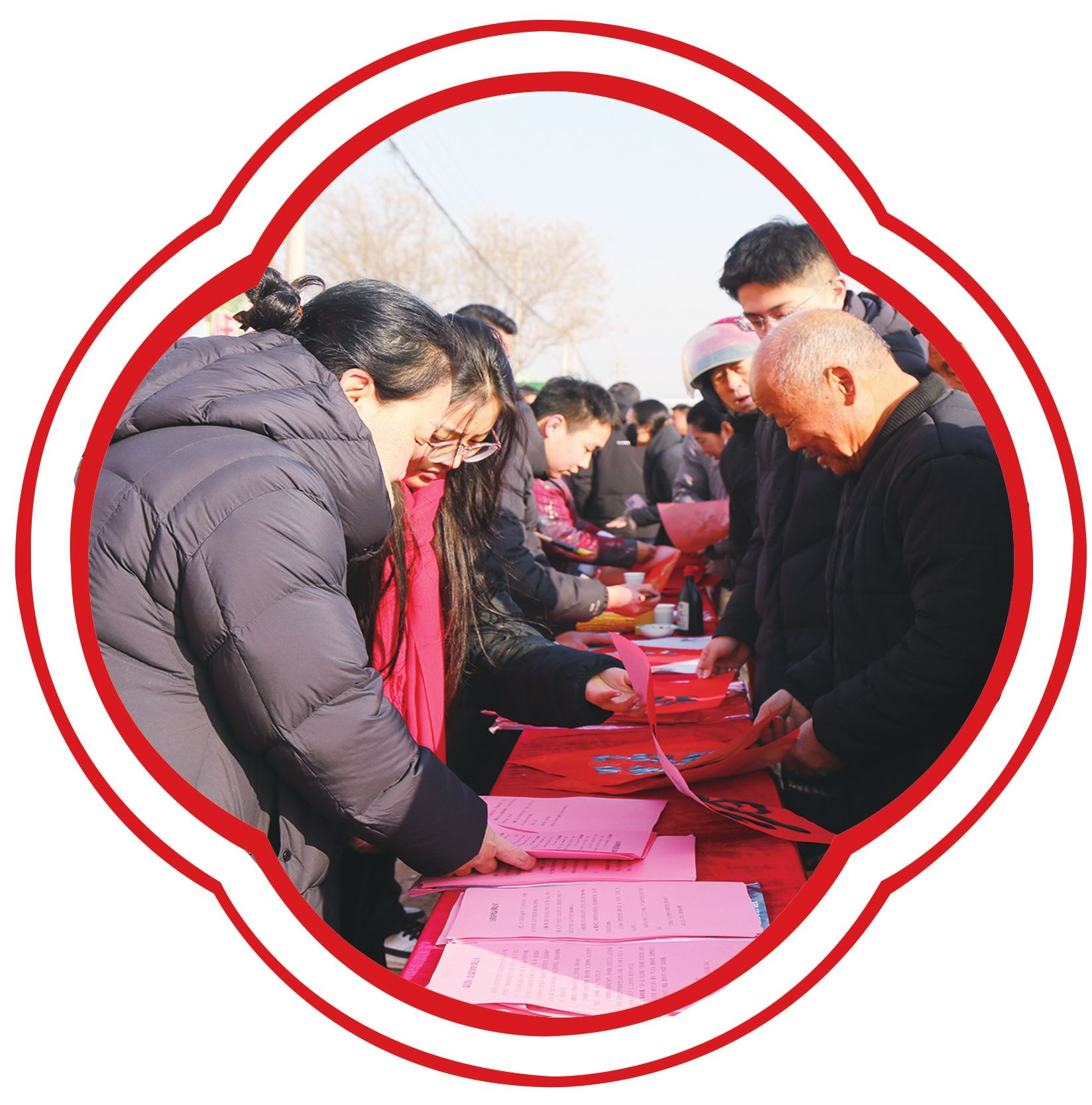 走過書畫攝影新聞展區(qū),集市東頭小廣場上喧天的鑼鼓聲同樣也“吸粉”無數(shù),火紅的秧歌隊歡騰起舞,吸引著群眾駐足圍觀。一旁的書法案桌早已被人群圍攏,書法家們根據(jù)大家要求“私人訂制”,春聯(lián)和“?!弊帜E未干便被欣喜取走。在移風易俗宣傳展位前,志愿者用通俗易懂的語言為鄉(xiāng)親們講解文明新風尚,引導大家文明迎新春、平安過大年。